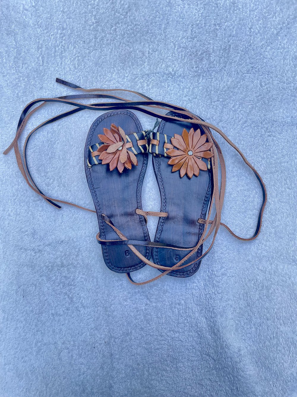 Delicada e romântica, com flores artesanais aplicadas sobre as tiras em couro marrom escuro.